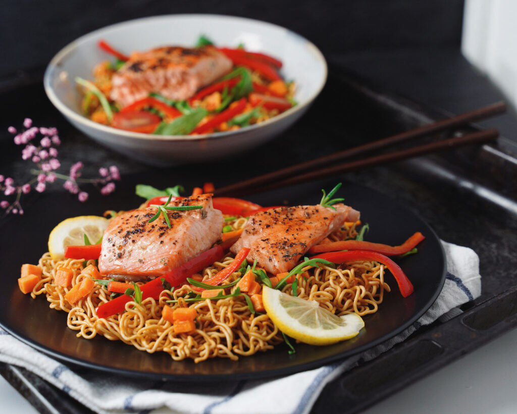 Ein köstlich, umami-reicher Geschmack der von scharf angebratenem Gemüse und zitronigem Lachsfilet abgerundet wird.
